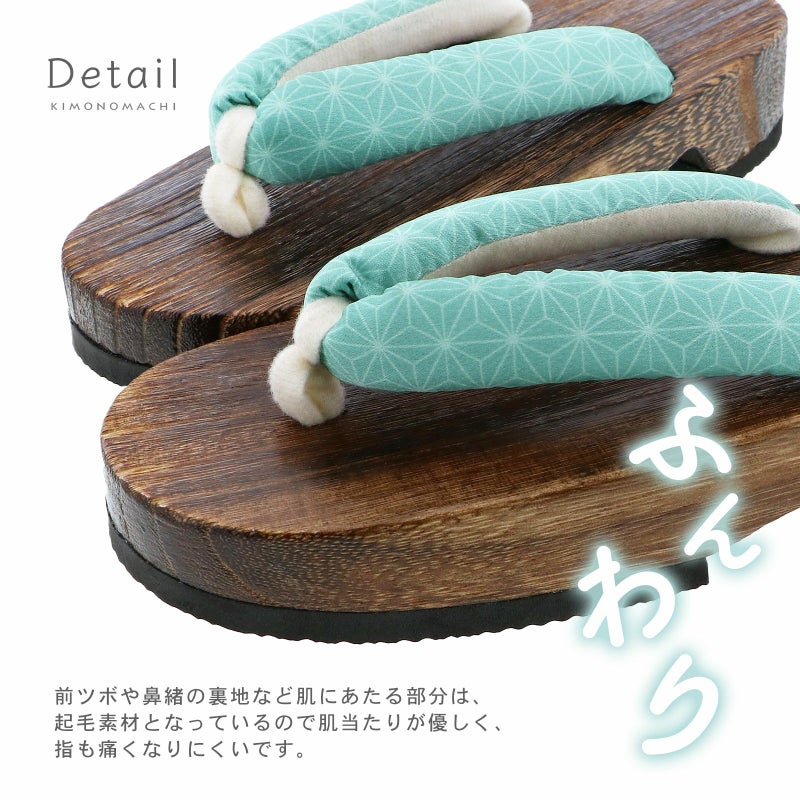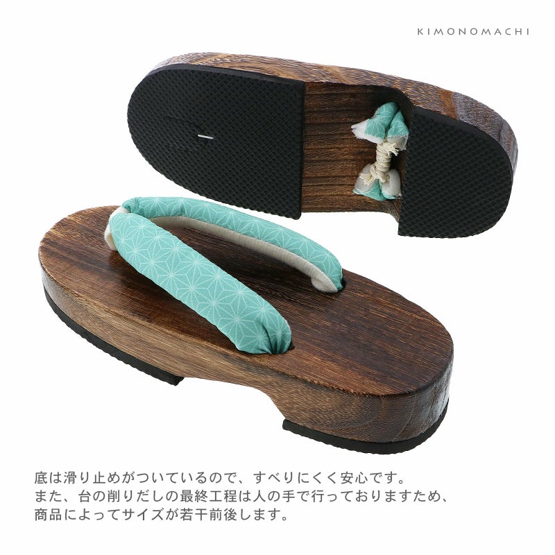 【色柄】鼻緒は青緑地の地に麻の葉模様、鼻をの裏は白。前坪は白。台は焼桐の焦げ茶色。