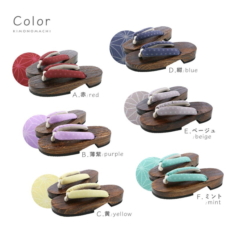 C.麻の葉 黄色:鼻緒は薄黄色の地に麻の葉模様、鼻緒の裏は白。前坪は白。台は焼桐の焦げ茶色。