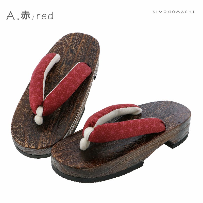 A.麻の葉 赤:鼻緒は赤の地に麻の葉模様、鼻緒の裏は白。前坪は白。台は焼桐の焦げ茶色。