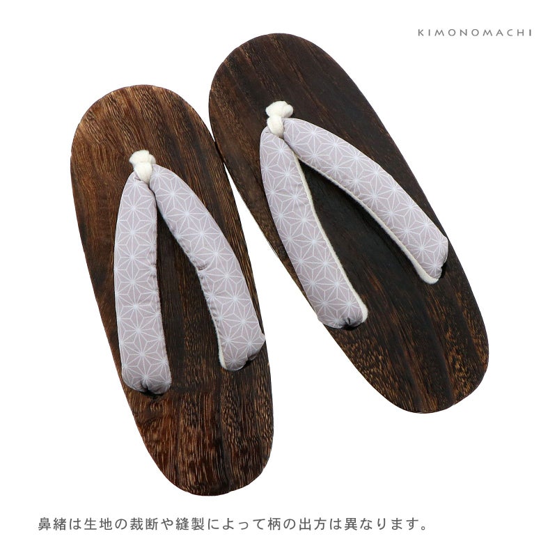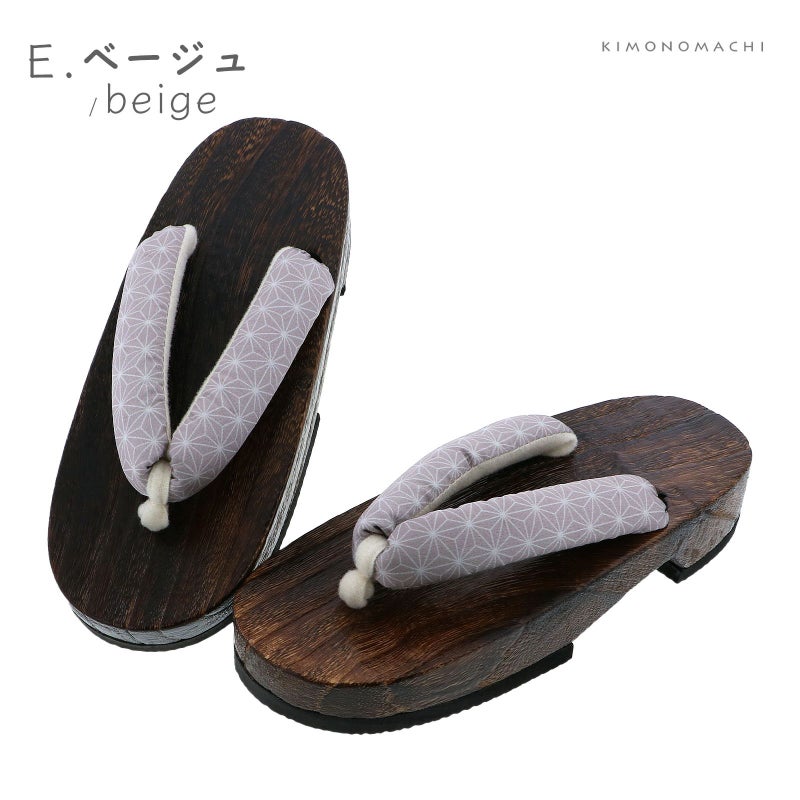 E.麻の葉 ベージュ:鼻緒はベージュの地に麻の葉模様、鼻緒の裏は白。前坪は白。台は焼桐の焦げ茶色。