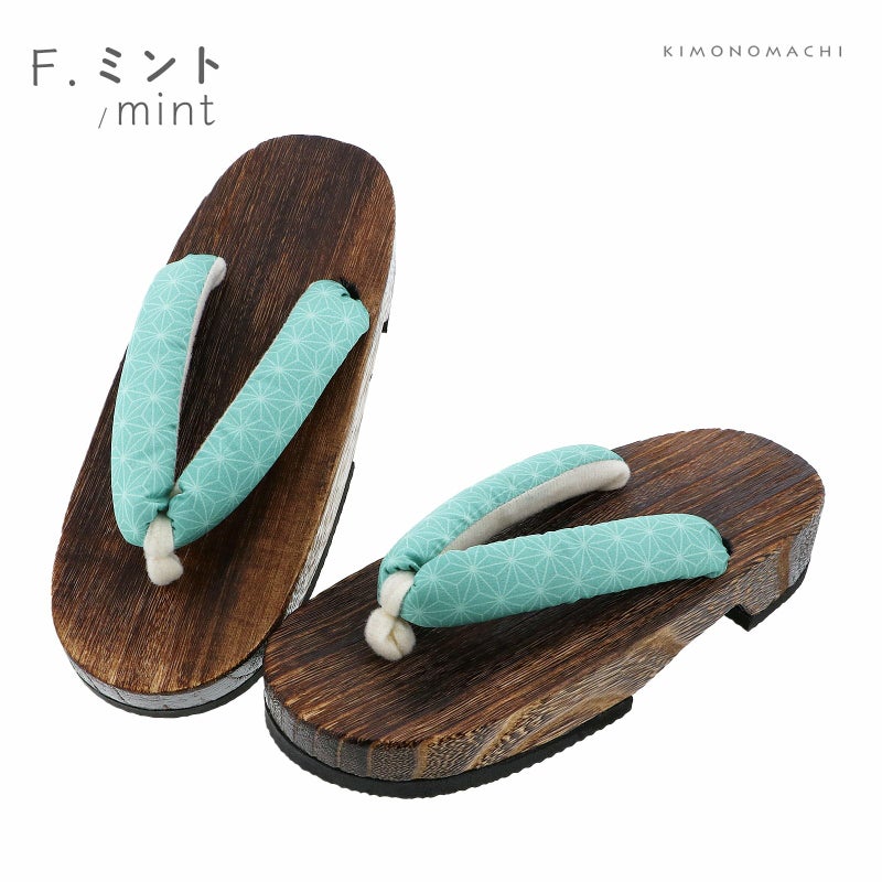 F.麻の葉 ミント:鼻緒は青緑地の地に麻の葉模様、鼻緒の裏は白。前坪は白。台は焼桐の焦げ茶色。