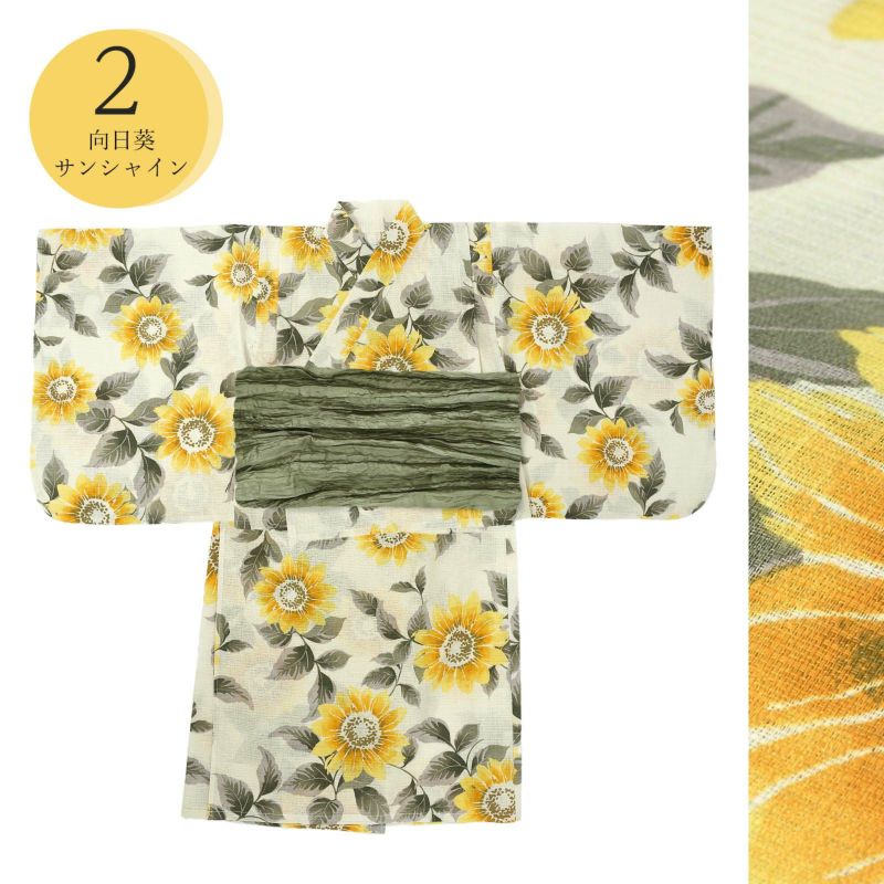 浴衣:アイボリーの地に浅い抹茶色、黄色、淡い黄色で表現されたヒマワリの花。夏の太陽のような明るい黄色と、輪郭のない水彩調のぼかした表現がさわやかなデザインです。