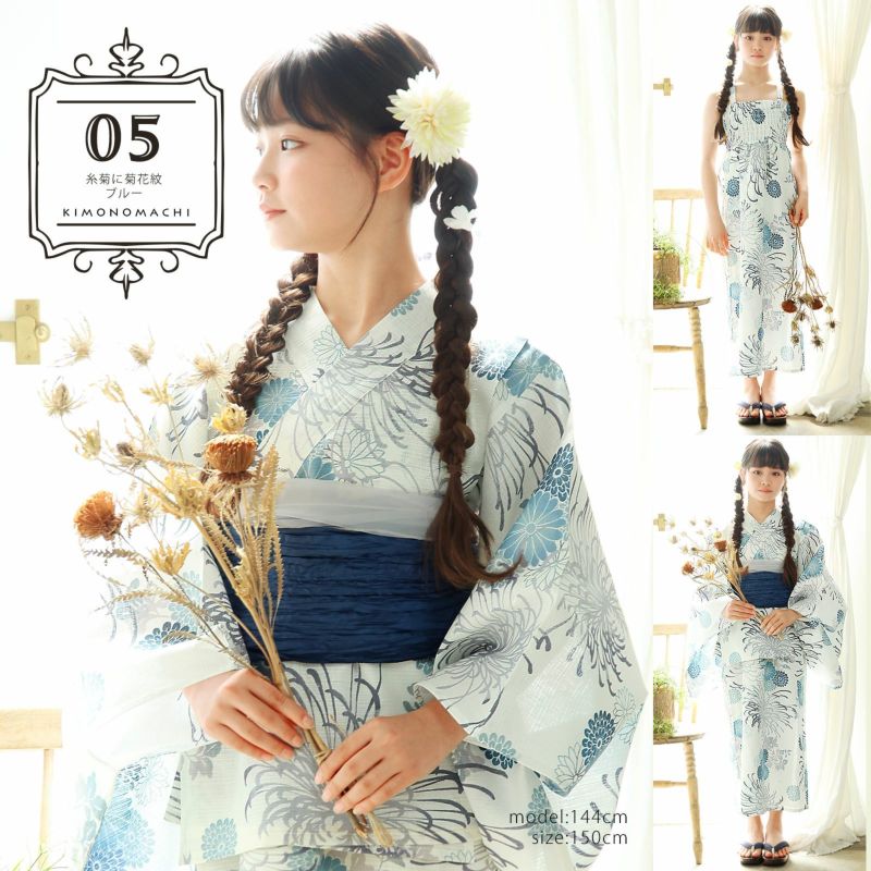 浴衣:アイボリーの地に、グレーと青紫のぼかしの入った大きな糸菊の花。紺や浅葱色、ブルーグレーの菊の花紋にグレーの葉。糸菊の繊細な華やかさとシックな配色が大人っぽい雰囲気です。