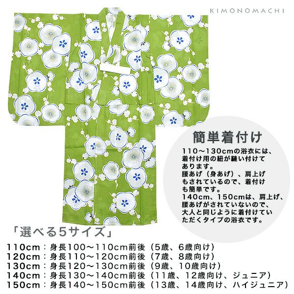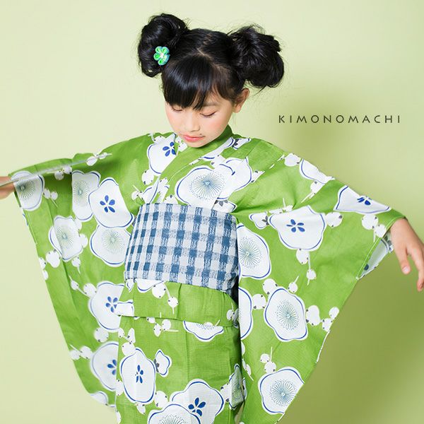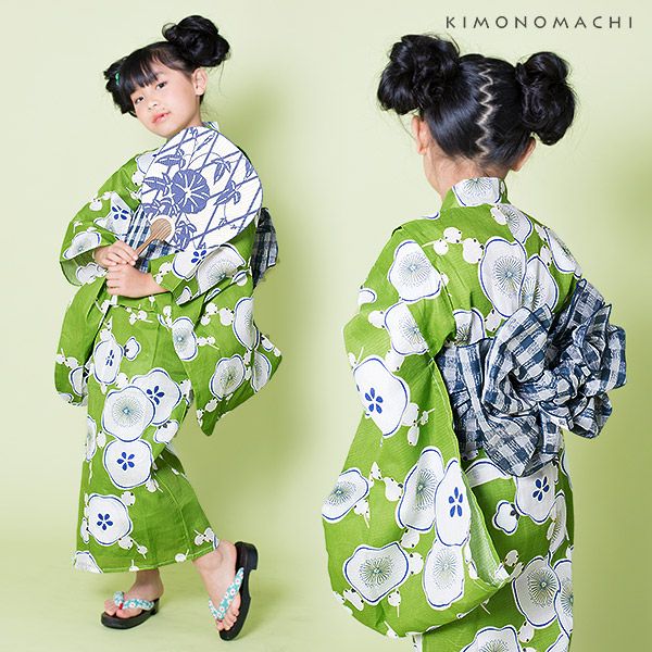 6. こども浴衣2点セット「緑色 梅」110cm、120cm、130cm、140cm、150cm 女の子浴衣セット 夏祭り、花火大会に レトロ KIMONOMACHI 【メール便不可】ss2206kkd15