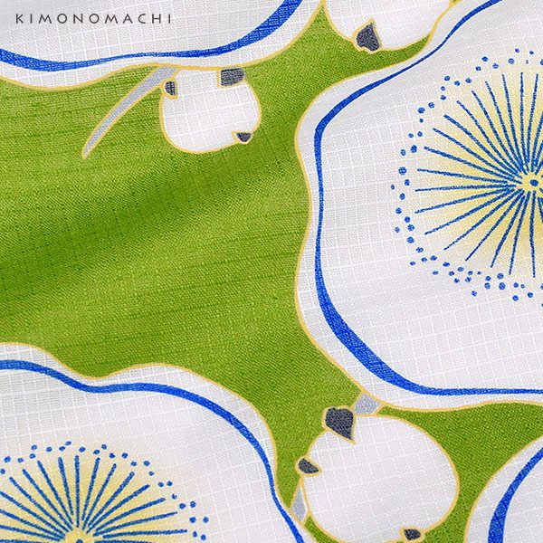 【カラー】浴衣は、濃い黄緑地に柔らかな丸みと曲線のある白い梅の花模様。帯は、全体に少しグレーがかった青色のチェック柄。