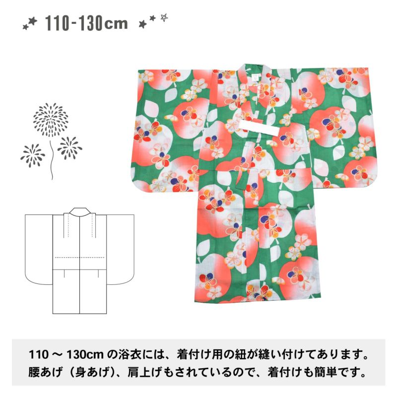 110cm、120cm、130cmの浴衣には着付け用に紐が縫い付けられていて、身あげ、肩上げがされています。140cm、150cmは大人と同じように着付けていただく仕様です。