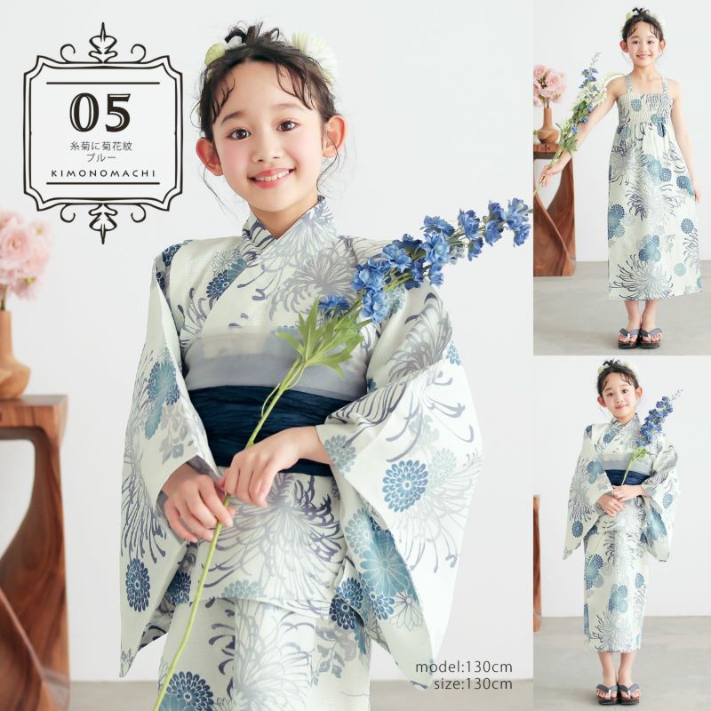 浴衣:アイボリーの地に、グレーと青紫のぼかしの入った大きな糸菊の花。紺や浅葱色、ブルーグレーの菊の花紋にグレーの葉。糸菊の繊細な華やかさとシックな配色が大人っぽい雰囲気です。