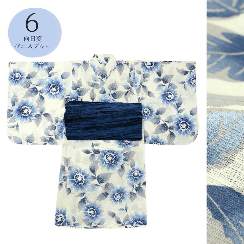 浴衣:アイボリーの地に紺色、グレイッシュな淡いブルー、ブルーグレーで表現されたヒマワリの花。夏の空のような透明感のある青と、輪郭のない水彩調のぼかした表現がさわやかなデザインです。