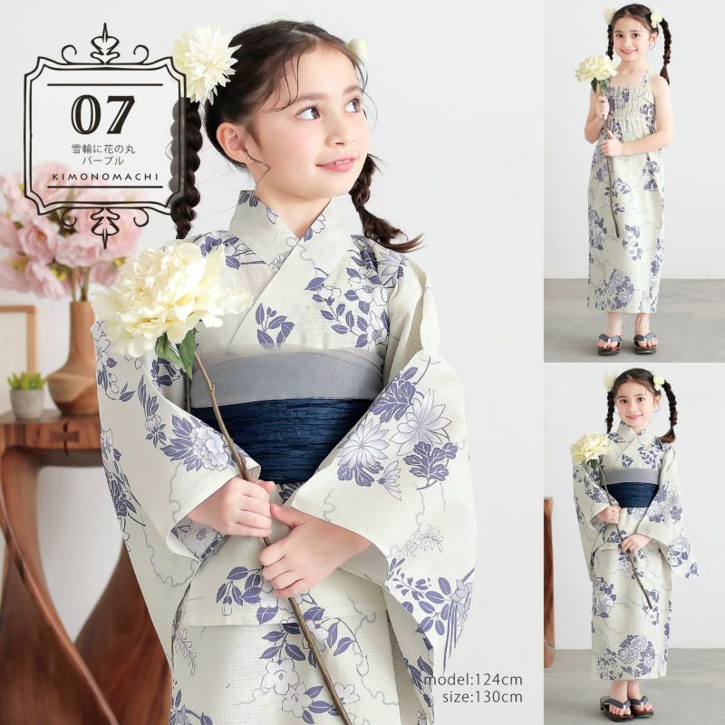 浴衣:アイボリーの地に青灰色の雪輪。白に淡い青みのパープル、青みの濃鼠色で表現された椿や蘭、萩に桔梗、牡丹、桜などの四季の花の丸文様。古典的な文様と現代的な色彩の組み合わせが魅力です。