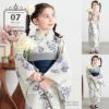 浴衣:ごく淡いグレーの地に灰色の雪輪。白に淡いグレー、浅い抹茶色、黒に近い深緑色で表現された椿や蘭、萩に桔梗、牡丹、桜などの四季の花の丸文様。古典的な文様とシックな色彩の組み合わせが魅力です。