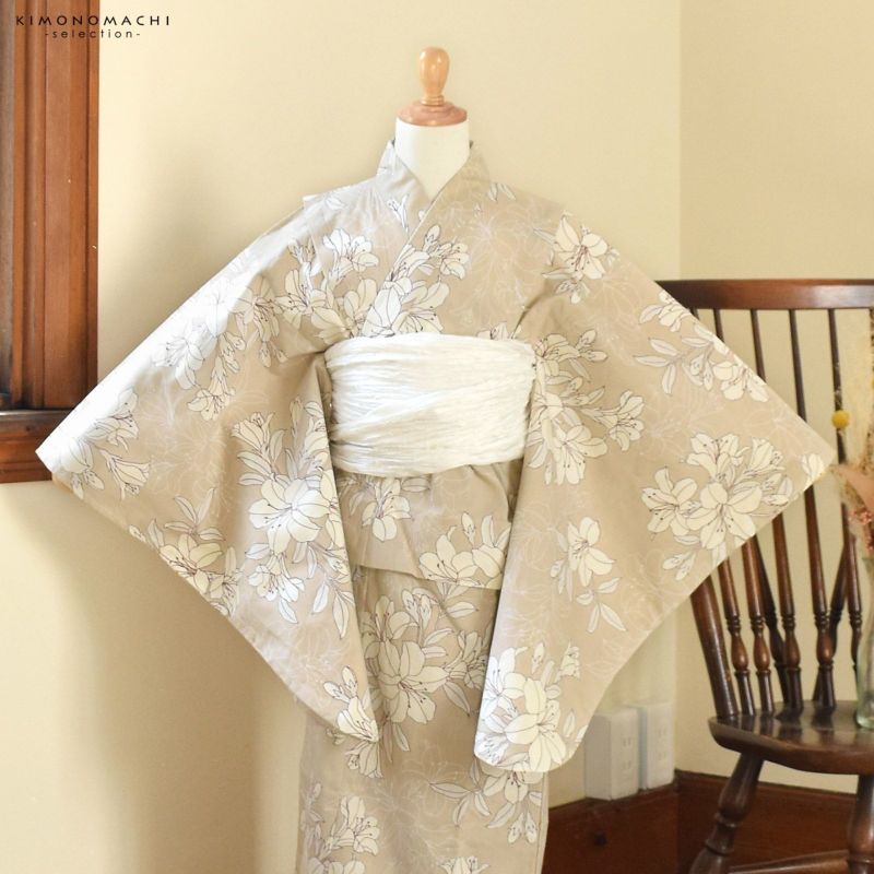 【色柄】カフェオレのような明るいベージュの地。濃茶色の線で描かれた百合の花は薄いクリーム色やごく淡いグレーの配色。白の輪郭線で描かれた百合のシルエット。