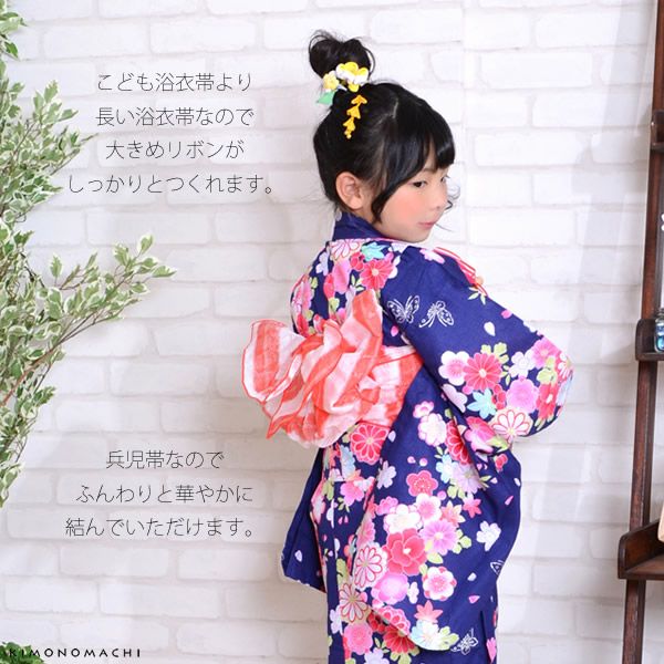 ジュニアサイズ向けの浴衣帯です。通常のこども用の浴衣帯よりも長く、大人用よりも短いので、ジュニアサイズのお子様に着付けていただきやすい帯です。柔らかな兵児帯タイプで、結びやすく、ふんわりとしたリボンで、華やかに結んでいただけます。