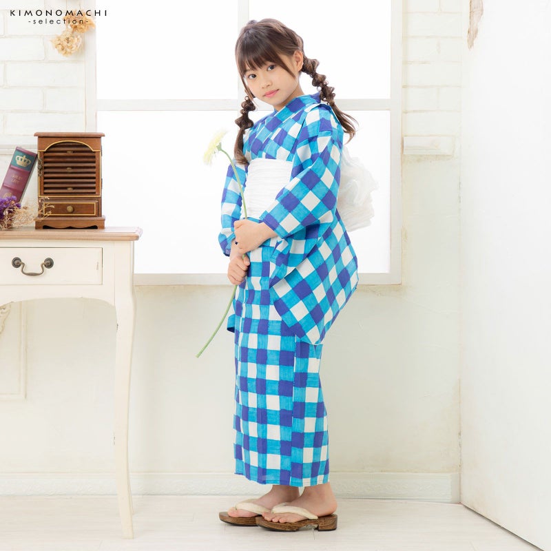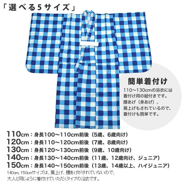 110~130cmの浴衣には着付け用に紐が縫い付けられていて、腰あげ(身あげ)、肩上げもされているので、着付けも簡単です。140cm、150cmサイズは、肩上げ、腰あげがされていないので、大人と同じように着付けていただくタイプの浴衣です。