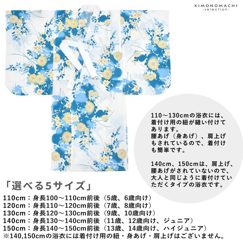 110cm、120cm、130cmの浴衣には着付け用に紐が縫い付けられていて、身あげ、肩上げがされています。140cm、150cmは大人と同じように着付けていただく仕様です。