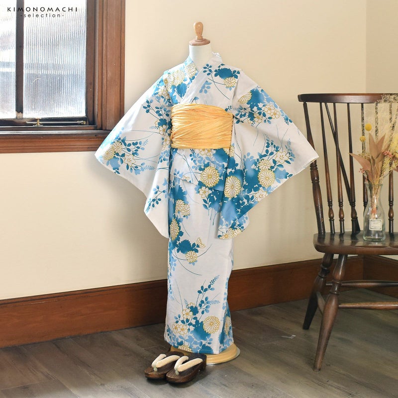 浴衣…白地に、濃い浅葱色の菊や萩、撫子のシルエット。ポイントにからし色の菊の花や、撫子、桔梗。