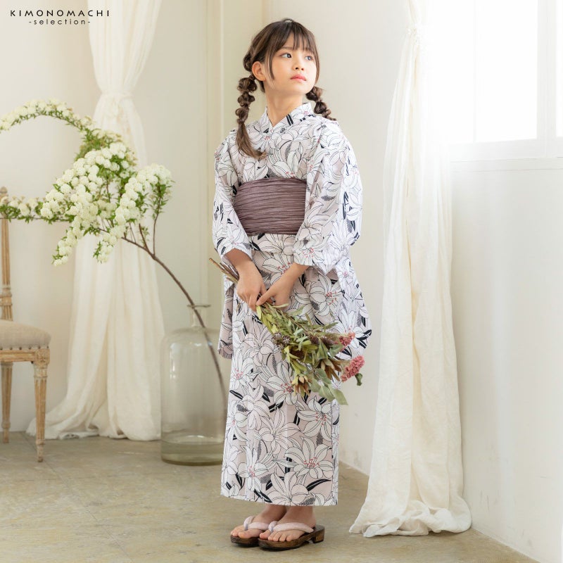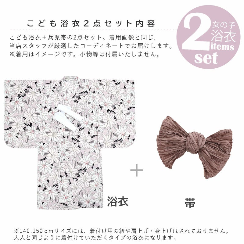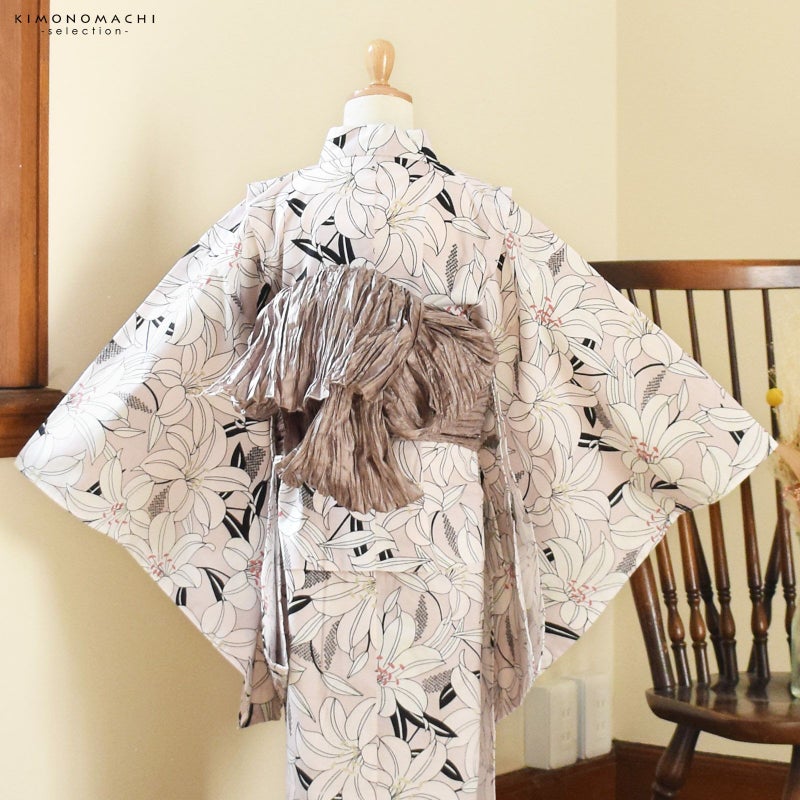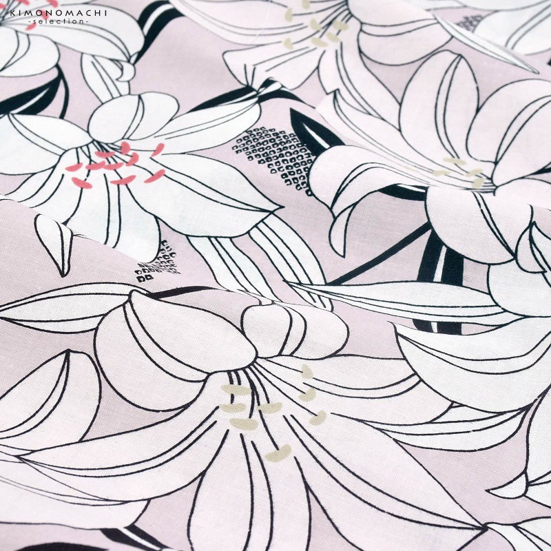 浴衣…くすんだ淡いピンク色の地。黒の輪郭線に薄ピンク、白の百合の花。ベージュや浅い赤の蕊がポイントです。