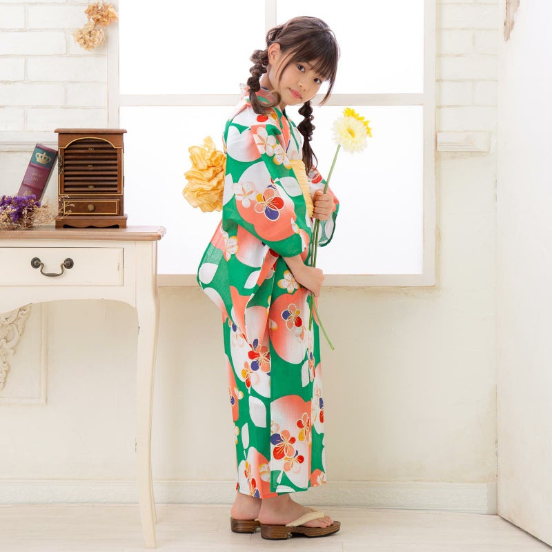 浴衣…鮮やかな緑色地に、レトロな雰囲気の大きなりんご型と、花びらが丸く可愛い花模様が点在。りんごは薄いピンクレッドと白色のグラデーション。花部分は花びらに、赤、黄色、青色、濃淡のピンクの色使い。