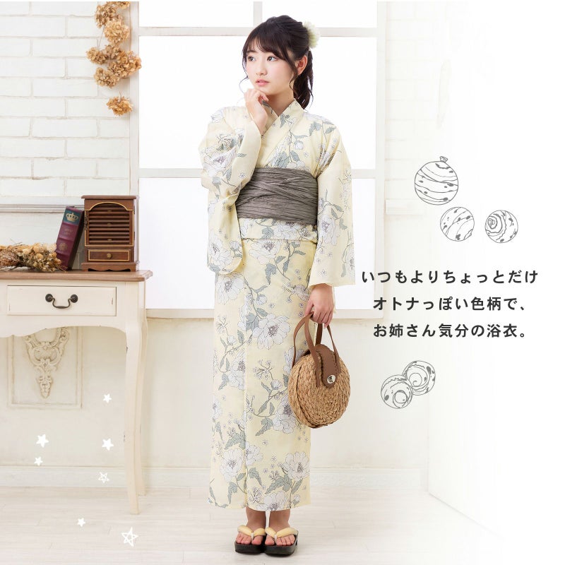 浴衣:明るいクリームイエローの地に濃茶色の線で描かれたアネモネや小花模様。オフホワイトやごく淡いベージュの花びら、淡いモスグレーの葉。