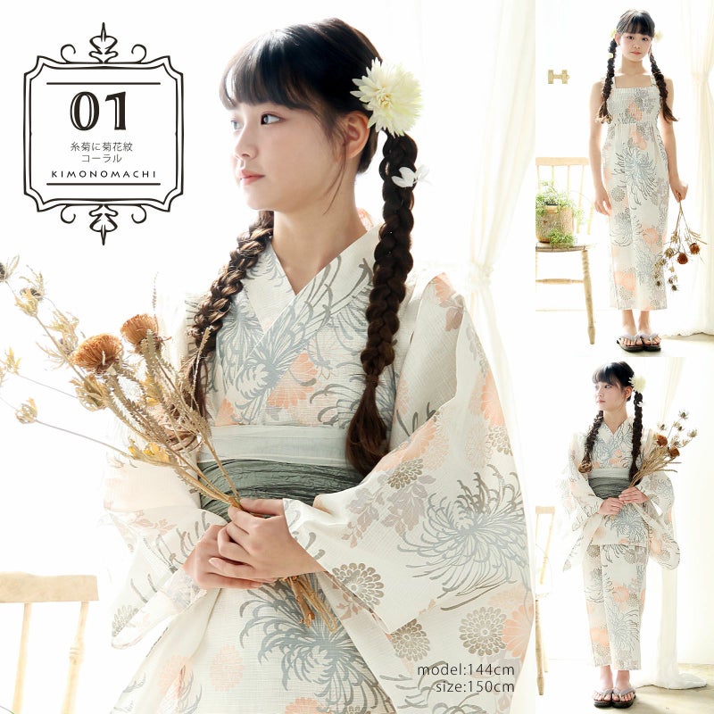 浴衣:アイボリーの地に、グレーと抹茶色のぼかしの入った大きな糸菊の花。コーラルピンクや抹茶色、淡い桃色の菊の花紋にウォームグレーの葉。糸菊の繊細な華やかさと優しい配色が落ち着いたかわいらしい雰囲気です。