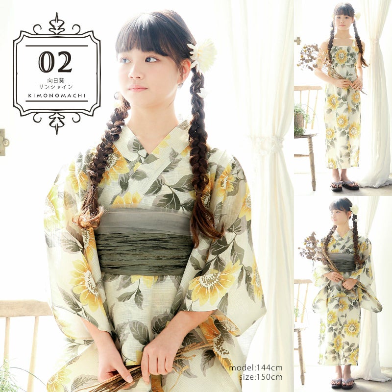 浴衣:アイボリーの地に浅い抹茶色、黄色、淡い黄色で表現されたヒマワリの花。夏の太陽のような明るい黄色と、輪郭のない水彩調のぼかした表現がさわやかなデザインです。