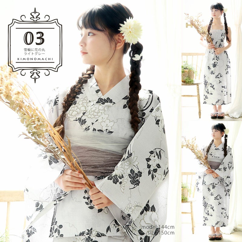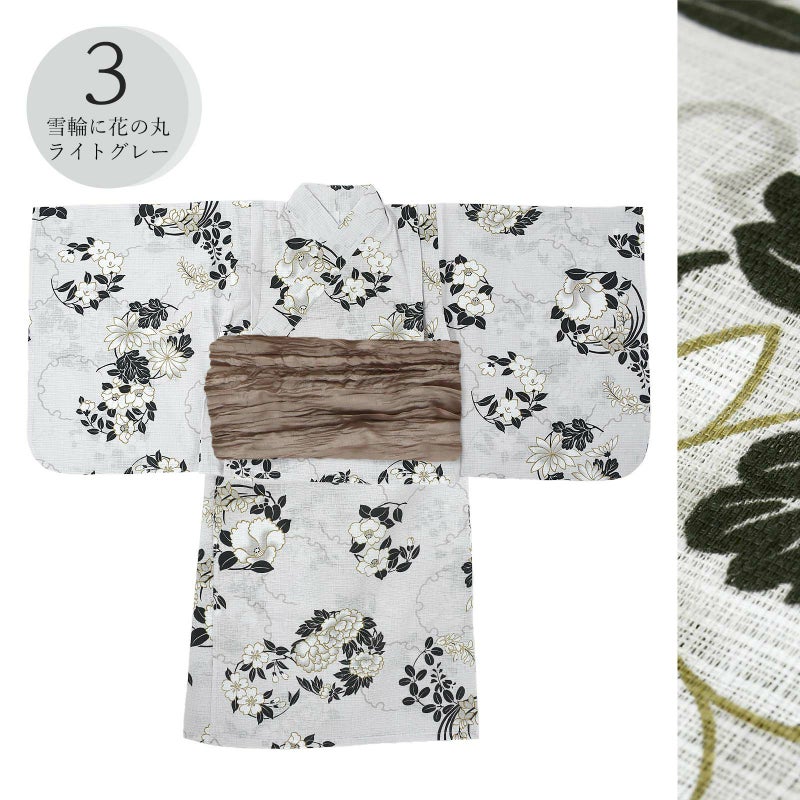 浴衣:ごく淡いグレーの地に灰色の雪輪。白に淡いグレー、浅い抹茶色、黒に近い深緑色で表現された椿や蘭、萩に桔梗、牡丹、桜などの四季の花の丸文様。古典的な文様とシックな色彩の組み合わせが魅力です。