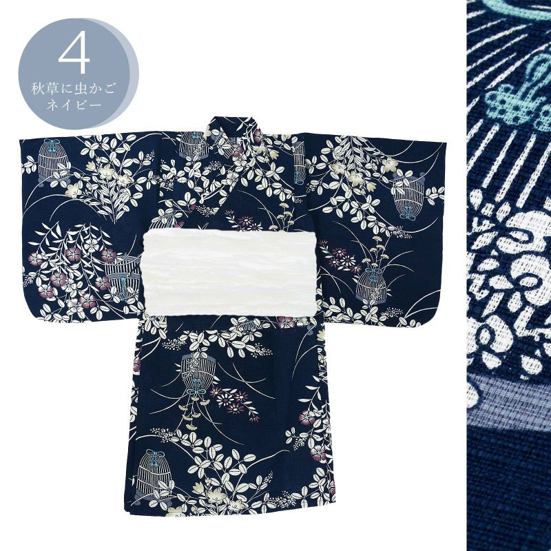 浴衣:青藍の地に白抜きで表現された萩や桔梗、撫子、芝草の秋草文様に浅い黄土色や深い赤みの紫の挿し色。白に青灰色、浅い水色の紐を添えた虫かごが物語を感じさせます。