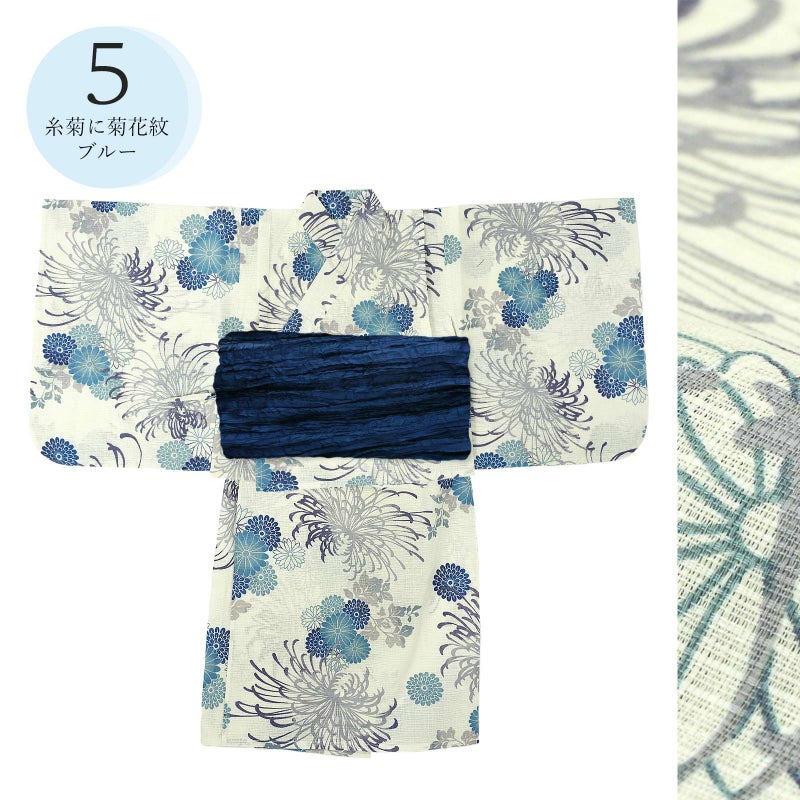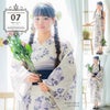 浴衣:アイボリーの地に、グレーと青紫のぼかしの入った大きな糸菊の花。紺や浅葱色、ブルーグレーの菊の花紋にグレーの葉。糸菊の繊細な華やかさとシックな配色が大人っぽい雰囲気です。