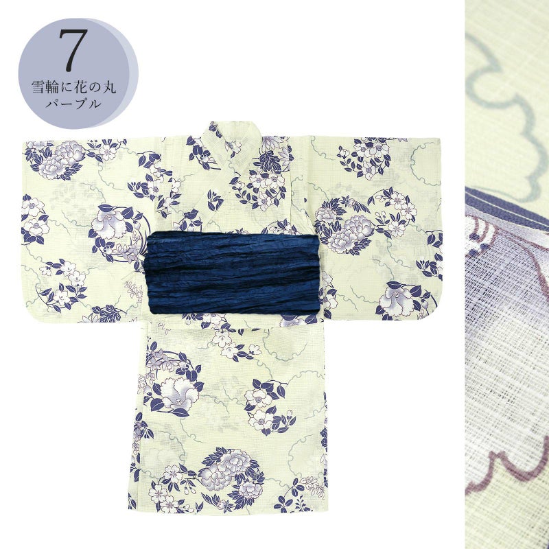浴衣:アイボリーの地に青灰色の雪輪。白に淡い青みのパープル、青みの濃鼠色で表現された椿や蘭、萩に桔梗、牡丹、桜などの四季の花の丸文様。古典的な文様と現代的な色彩の組み合わせが魅力です。