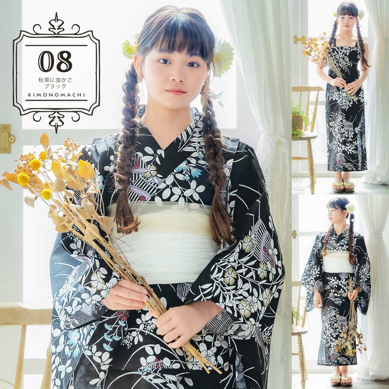 浴衣:黒地に白抜きで表現された萩や桔梗、撫子、芝草の秋草文様にグレイッシュな淡いブルーや浅い抹茶色の挿し色。白に藤色、臙脂の紐を添えた虫かごが物語を感じさせます。