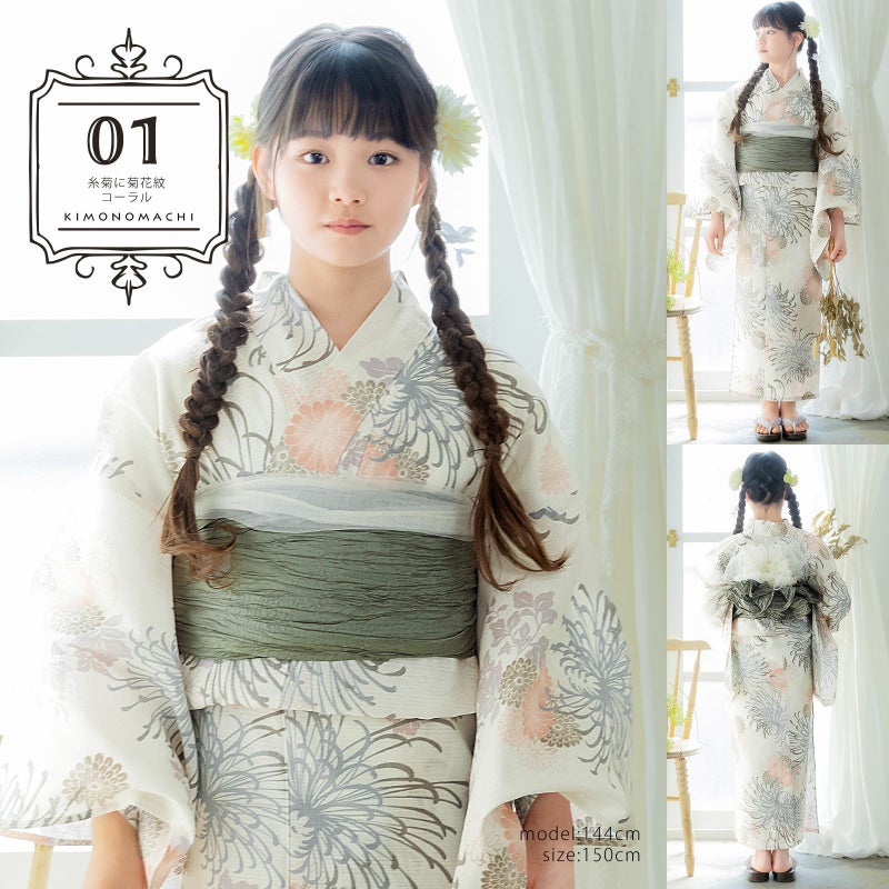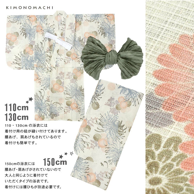浴衣:アイボリーの地に、グレーと抹茶色のぼかしの入った大きな糸菊の花。コーラルピンクや抹茶色、淡い桃色の菊の花紋にウォームグレーの葉。糸菊の繊細な華やかさと優しい配色が落ち着いたかわいらしい雰囲気です。