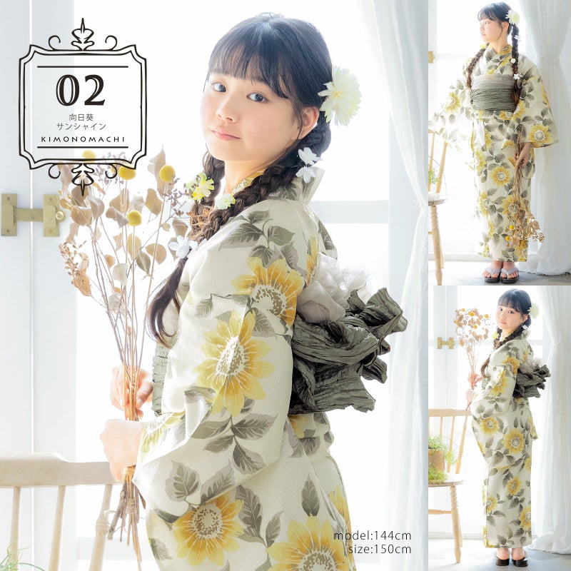 浴衣:アイボリーの地に浅い抹茶色、黄色、淡い黄色で表現されたヒマワリの花。夏の太陽のような明るい黄色と、輪郭のない水彩調のぼかした表現がさわやかなデザインです。