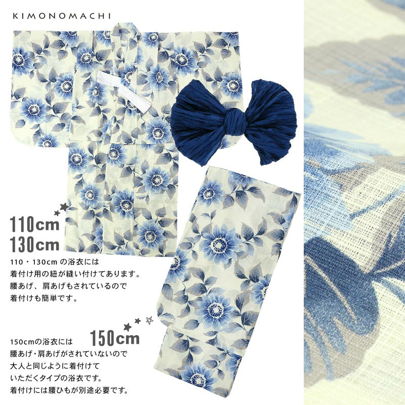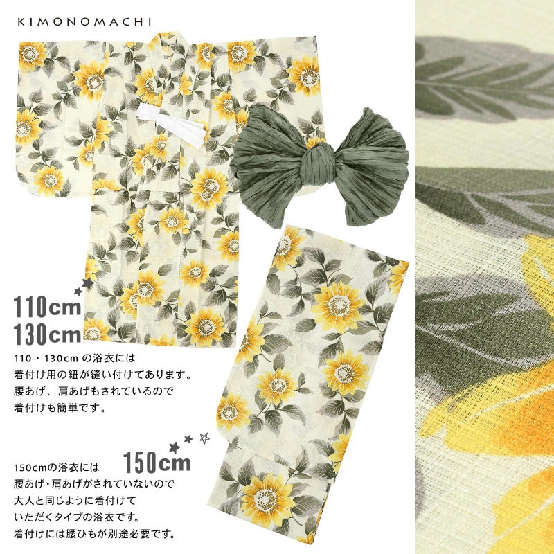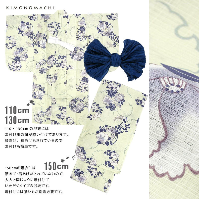 110cm、130cmの浴衣には着付け用に紐が縫い付けられていて、身あげ、肩上げがされています。150cmは大人と同じように着付けていただく仕様です。