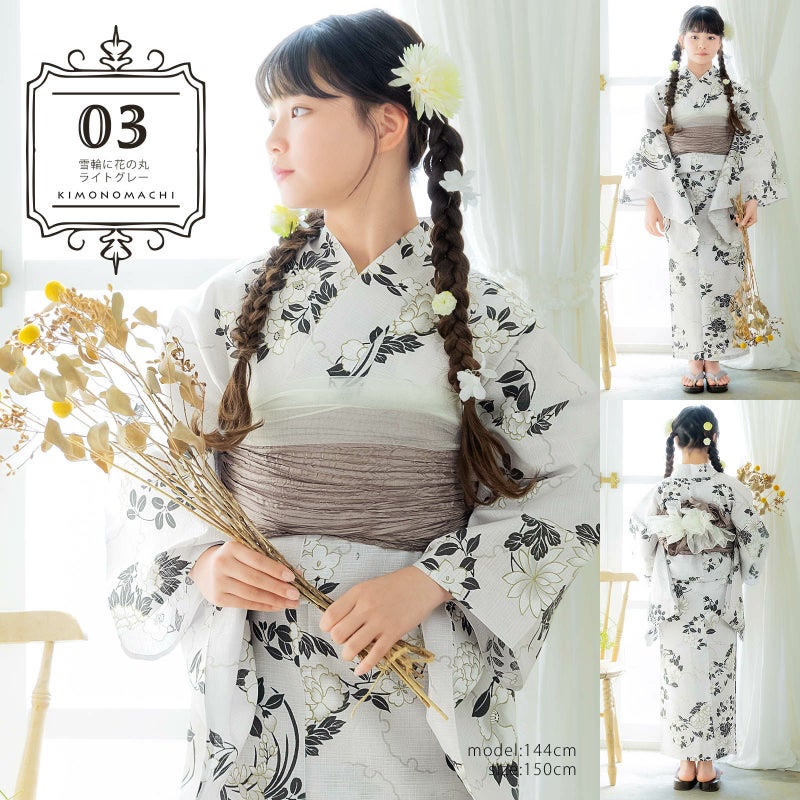 浴衣:ごく淡いグレーの地に灰色の雪輪。白に淡いグレー、浅い抹茶色、黒に近い深緑色で表現された椿や蘭、萩に桔梗、牡丹、桜などの四季の花の丸文様。古典的な文様とシックな色彩の組み合わせが魅力です。