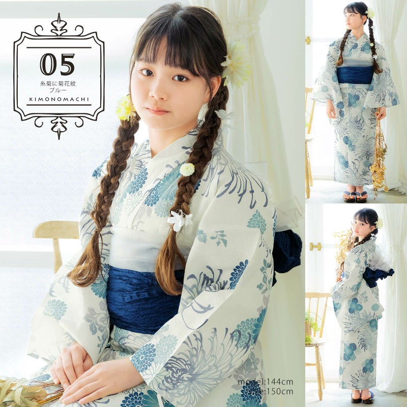 浴衣:アイボリーの地に、グレーと青紫のぼかしの入った大きな糸菊の花。紺や浅葱色、ブルーグレーの菊の花紋にグレーの葉。糸菊の繊細な華やかさとシックな配色が大人っぽい雰囲気です。
