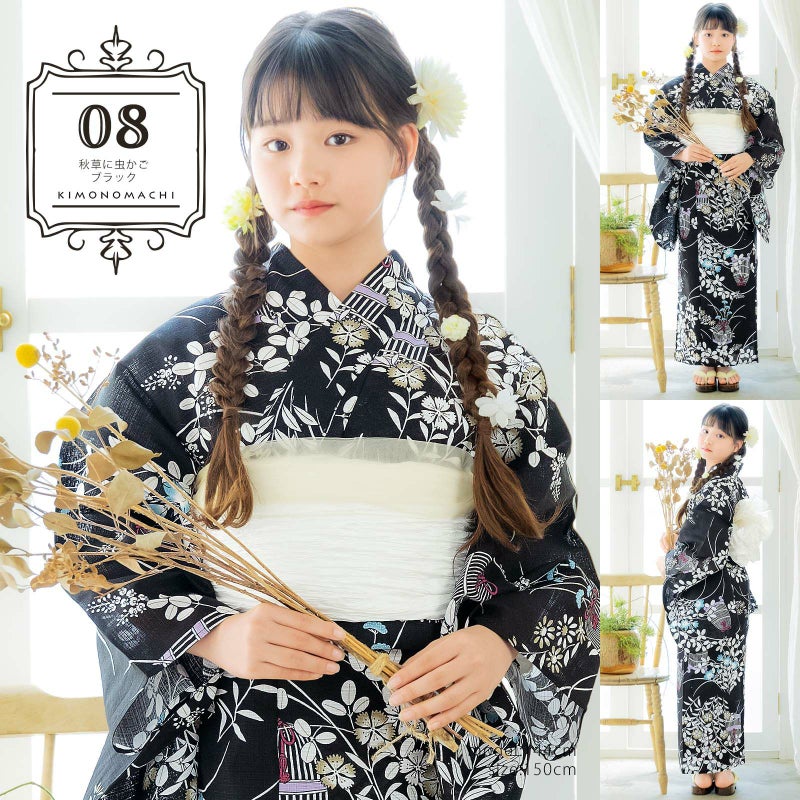 浴衣:黒地に白抜きで表現された萩や桔梗、撫子、芝草の秋草文様にグレイッシュな淡いブルーや浅い抹茶色の挿し色。白に藤色、臙脂の紐を添えた虫かごが物語を感じさせます。