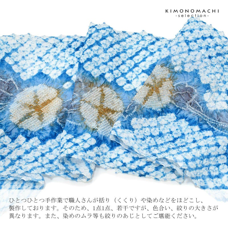 ※ひとつひとつ手作業で職人さんが括り(くくり)や染めなどをほどこし、製作しております。そのため、1点1点、若干ですが、色合い、絞りの大きさが異なります。また、染めのムラ等も絞りのあじとしてご堪能ください。