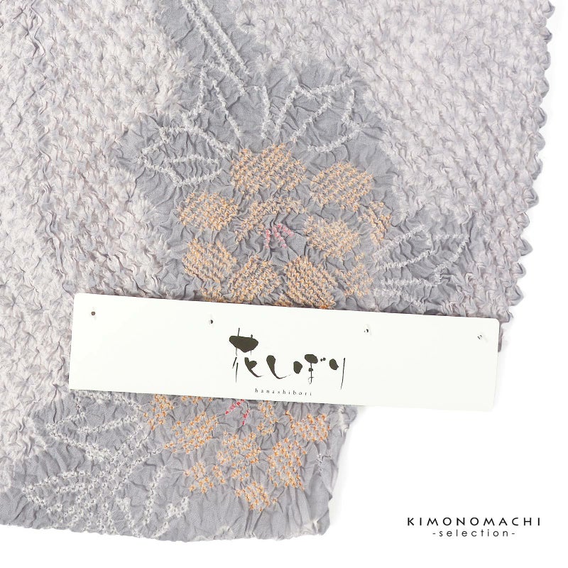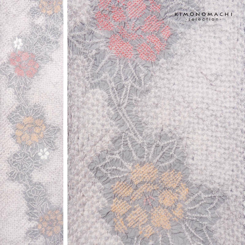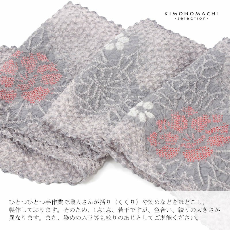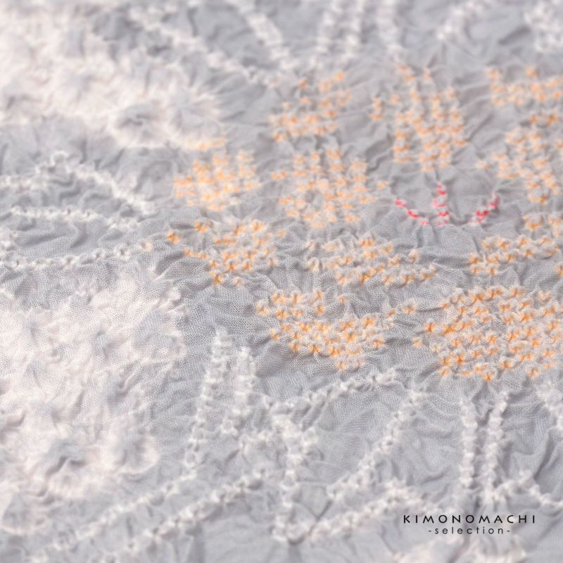 【色柄】淡いグレーにごく淡いピンクの三浦絞りを並べた地。細かな絞りを連ねて表現された牡丹の花、柔らかい紅赤や薄橙色の挿し色。