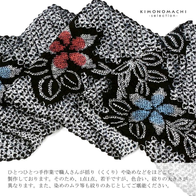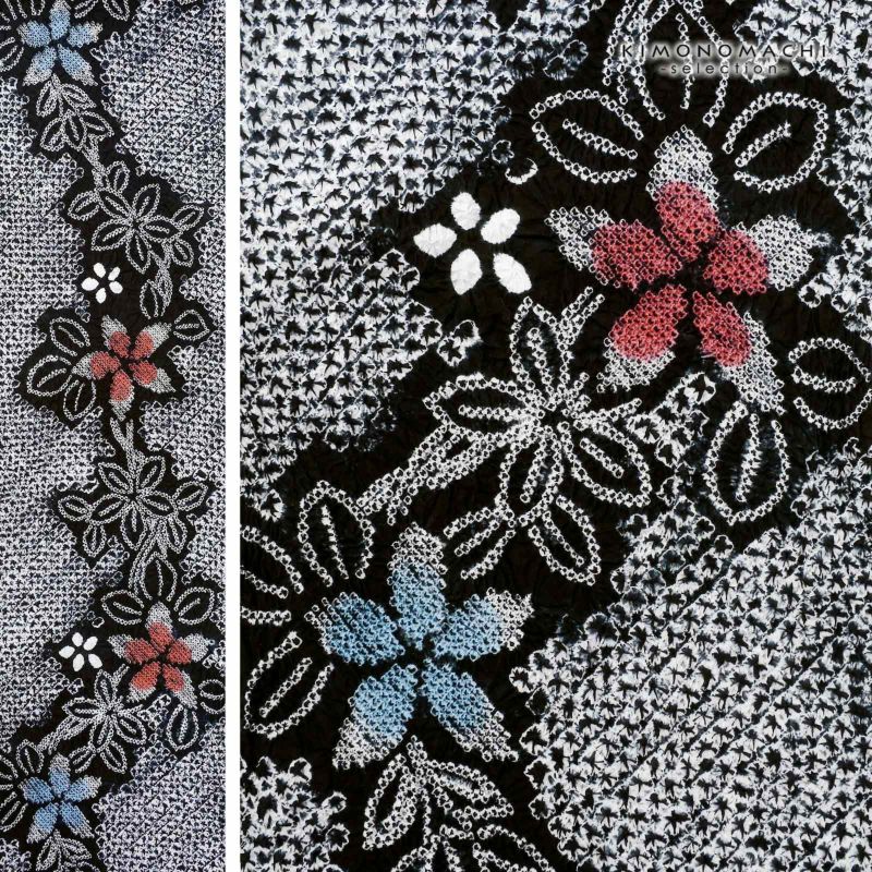 【色柄】黒に三浦絞りを並べた地。いろいろな絞りを組み合わせた流水に白いお花が流れるように配置されています。お花に薄赤と青の挿し色。