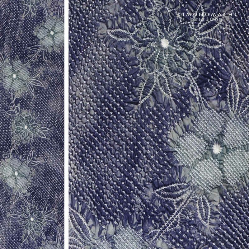【色柄】濃淡のあるグレイッシュな青紫に鹿の子を並べた地。ひと目絞りを連ねて流れるように表現された枝垂れ桜風のお花。お花に柳鼠色の挿し色。