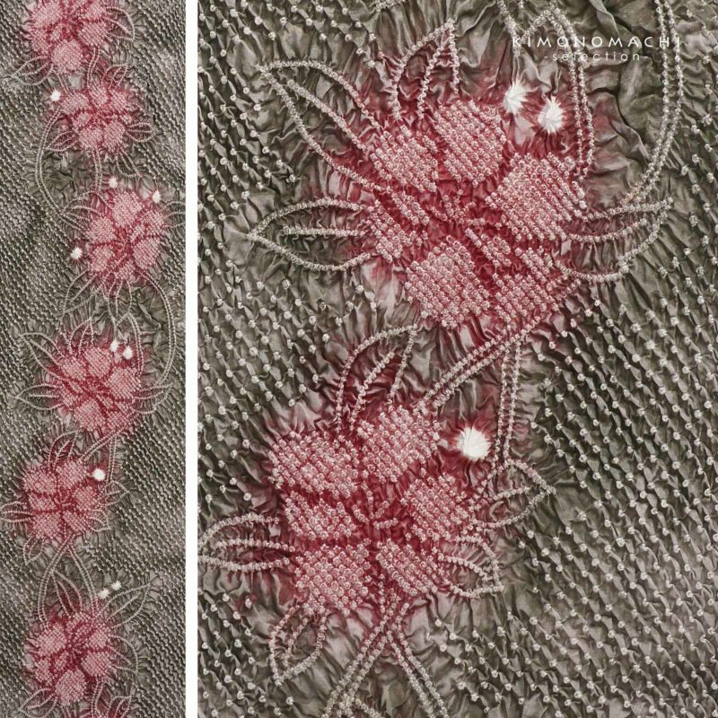 【色柄】濃淡のあるグレイッシュな抹茶色に鹿の子を並べた地。いろいろな絞りで表現された大きな花に蔓が流れるように配置されています。お花に鈍い赤の挿し色。