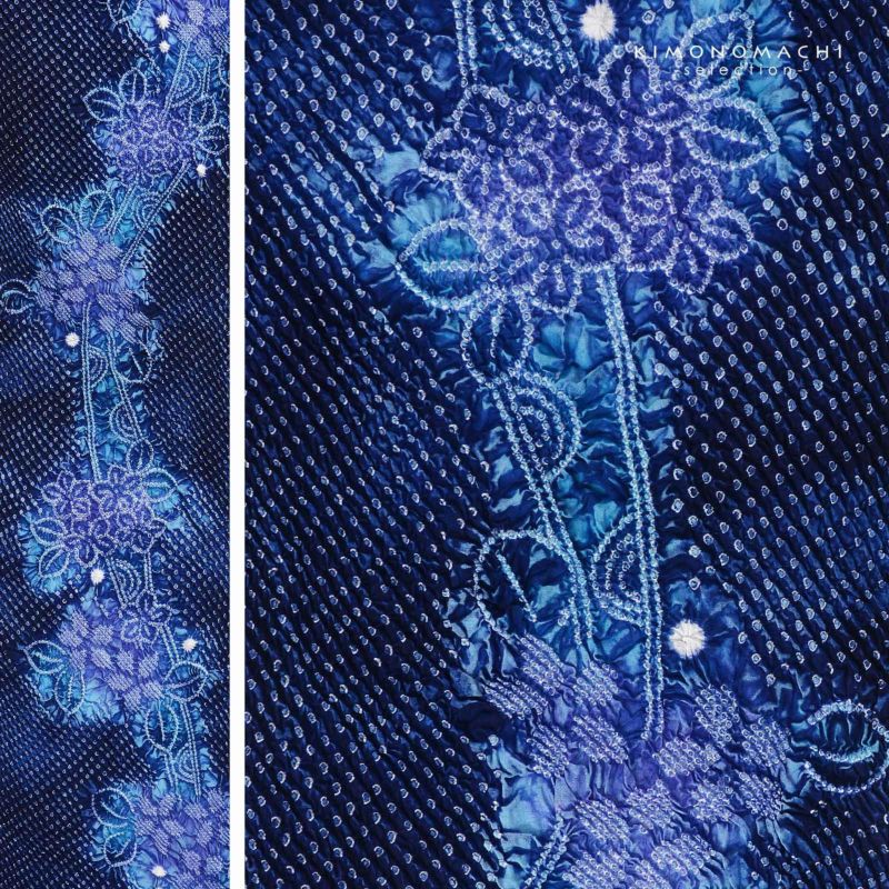 【色柄】濃淡のある紺藍に鹿の子を並べた地。ひと目絞りを連ねて流れるように表現された花蔓、その周りは縹色、お花に紫の挿し色。
