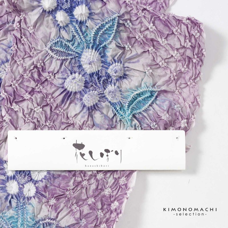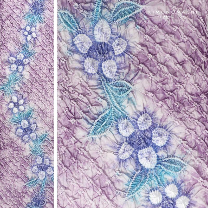【色柄】濃淡のある紅藤色に絞りの四つ花を並べた地。白い絞りで表現された丸いお花が流れるように配置されています。お花に青紫色、浅葱色の挿し色。