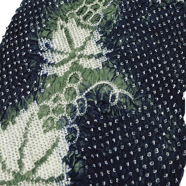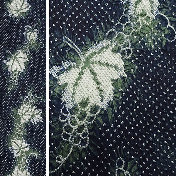 【カラー】濃藍に深い緑と鹿の子絞りで表現された葡萄の実と蔦。