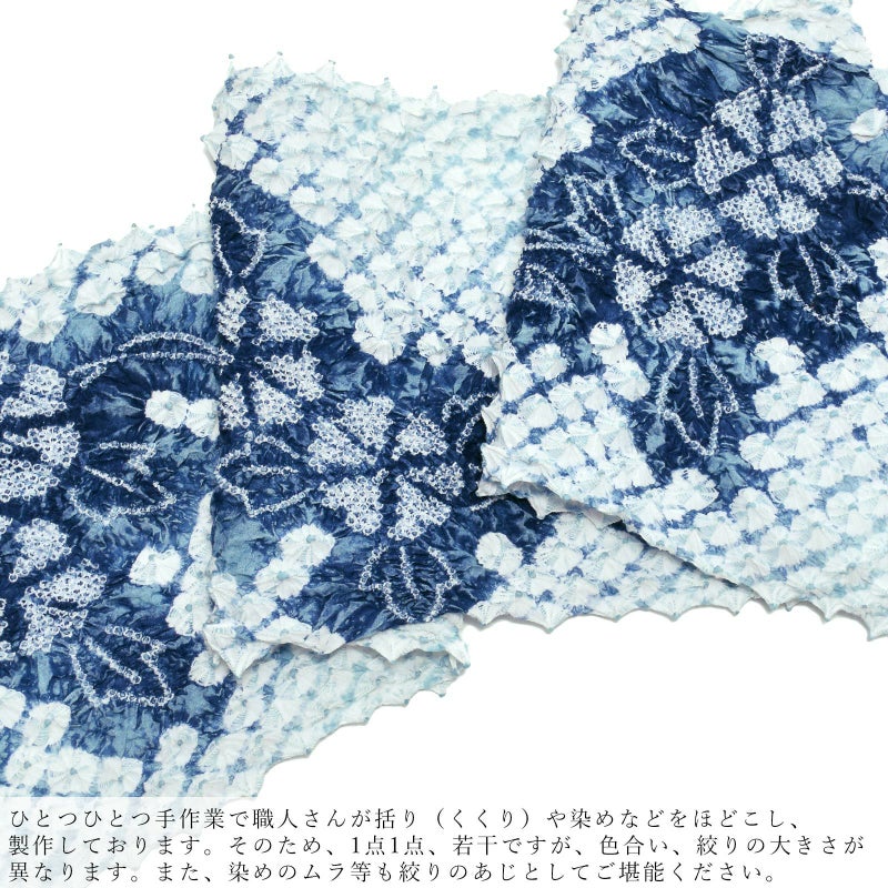 ※ひとつひとつ手作業で職人さんが括り(くくり)や染めなどをほどこし、製作しております。そのため、1点1点、若干ですが、色合い、絞りの大きさが異なります。また、染めのムラ等も絞りのあじとしてご堪能ください。
