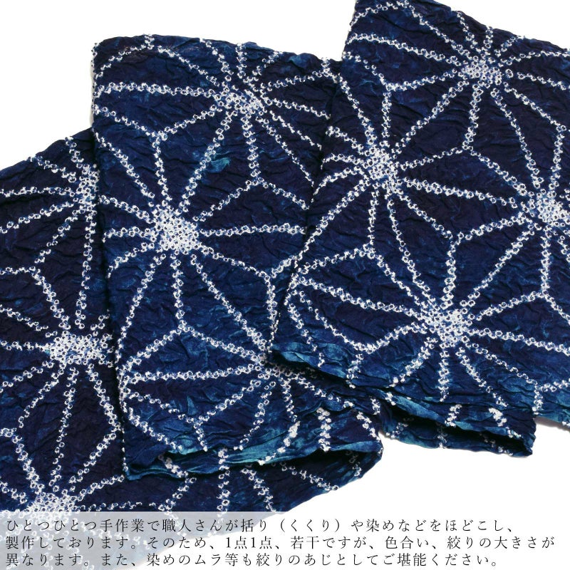 ※ひとつひとつ手作業で職人さんが括り(くくり)や染めなどをほどこし、製作しております。そのため、1点1点、若干ですが、色合い、絞りの大きさが異なります。また、染めのムラ等も絞りのあじとしてご堪能ください。