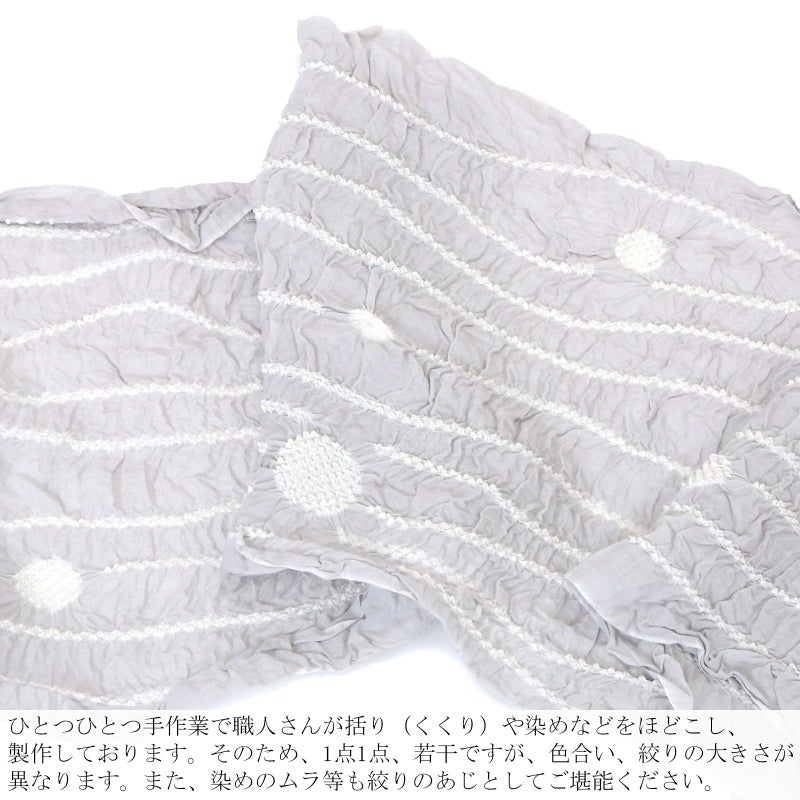 ※ひとつひとつ手作業で職人さんが括り(くくり)や染めなどをほどこし、製作しております。そのため、1点1点、若干ですが、色合い、絞りの大きさが異なります。また、染めのムラ等も絞りのあじとしてご堪能ください。