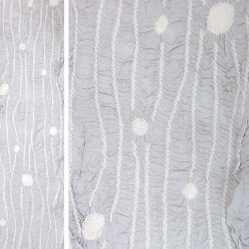 明るい薄グレーの地に白。細かな白の絞りを連ねたよろけ縞に水玉が、風に吹かれたようなふんわりとした雰囲気です。
