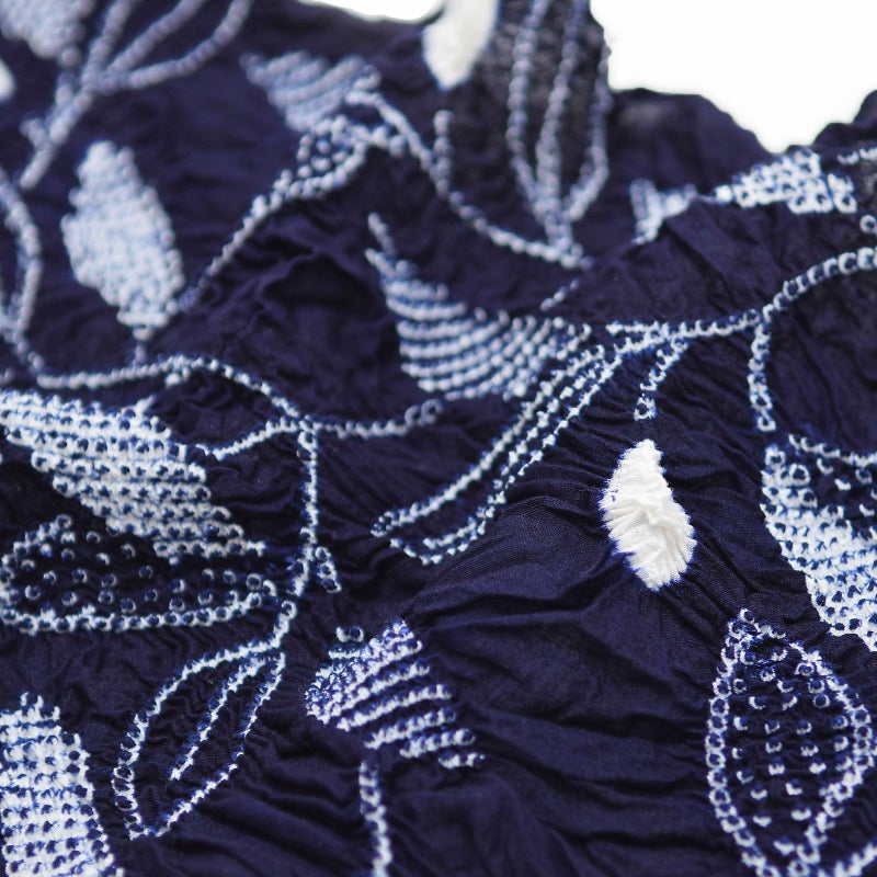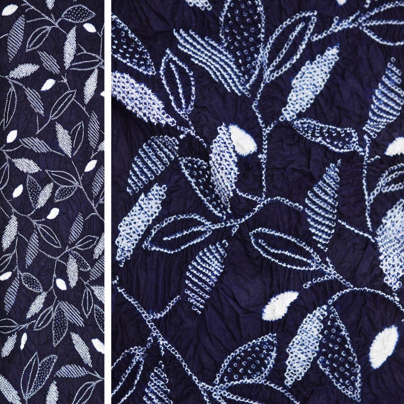 濃紺の地に白。疋田を繋げて表現された繊細な木の枝葉の模様。真っ白に絞られた実がポイントです。