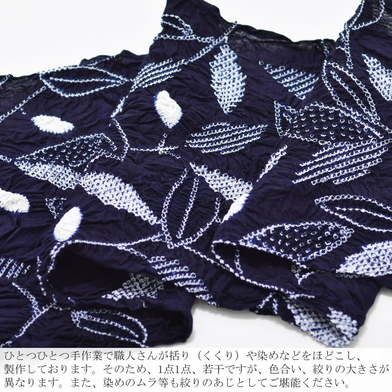 ※ひとつひとつ手作業で職人さんが括り(くくり)や染めなどをほどこし、製作しております。そのため、1点1点、若干ですが、色合い、絞りの大きさが異なります。また、染めのムラ等も絞りのあじとしてご堪能ください。