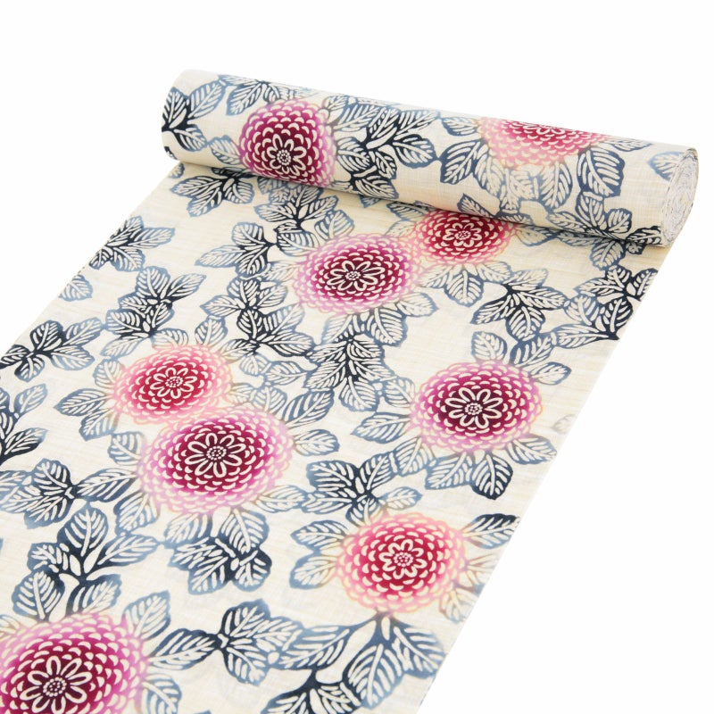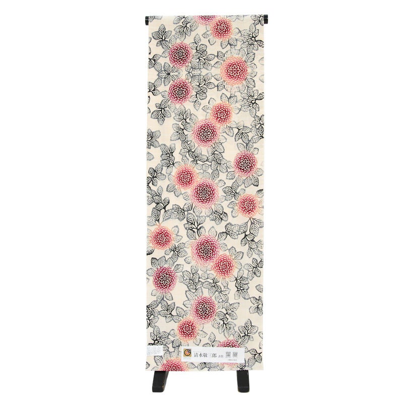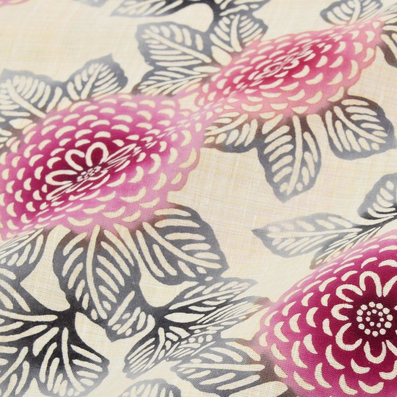 白と生成り色が交じり合った地に、深い赤や赤紫、橙色の花、墨色の葉で表現された八重のダリア。シンプルなデザインとぼかしの色の変化が魅力です。